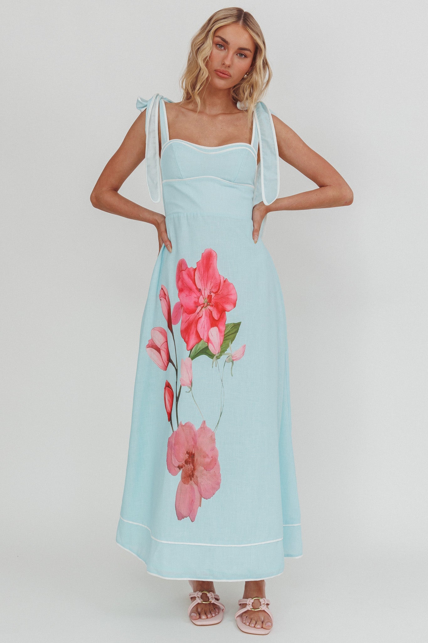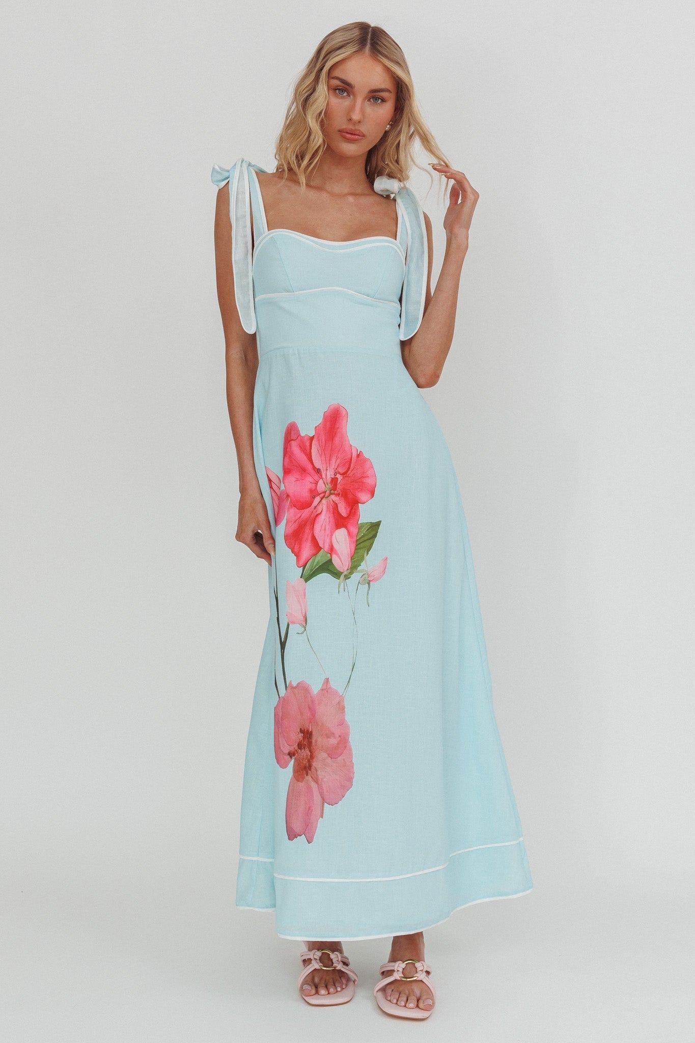 Effortlessly feminine, our Averin maxi dress is made to turn heads. We are in live with its cute, tied shoulders and pretty floral print. Style it with heels and a purse for weddings, garden parties, or sunset dinners.