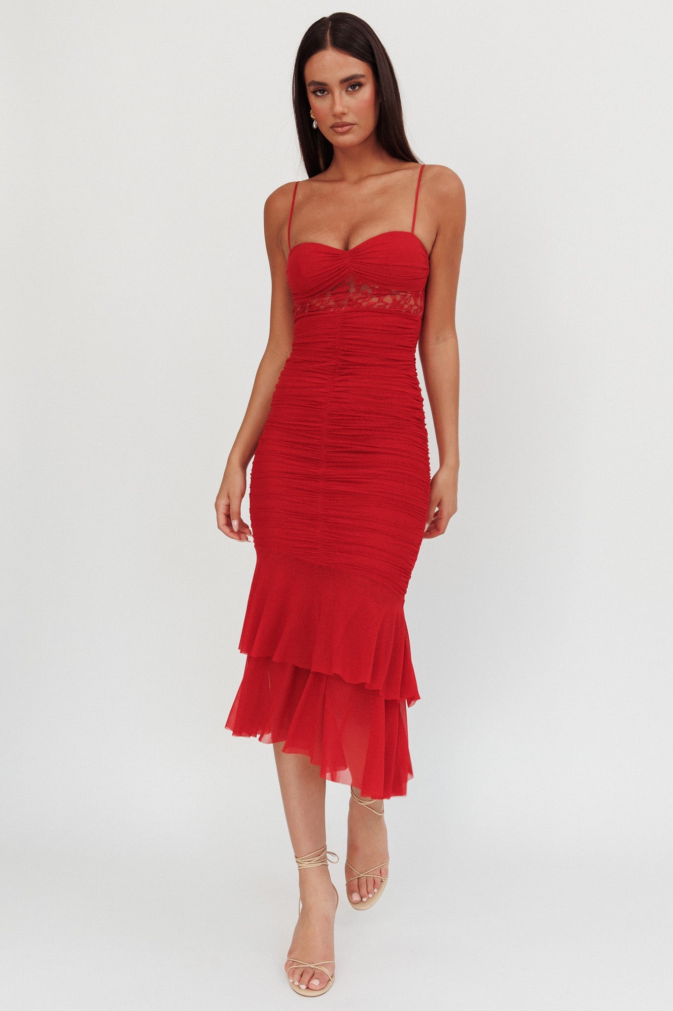 Steal the show in our gorgeous Cherubim midi dress. We are obsessed with its ruching detail throughout and lace bust. Perfect for a wedding or special occasion. Team it with nude heels and a clutch for a look that will turn heads.