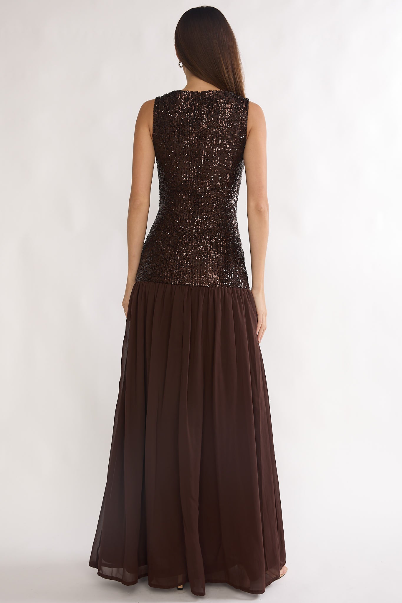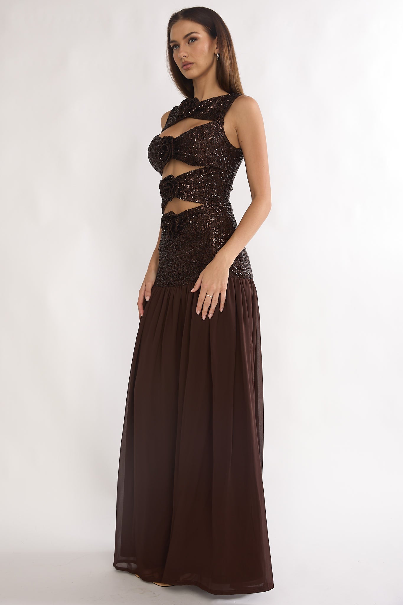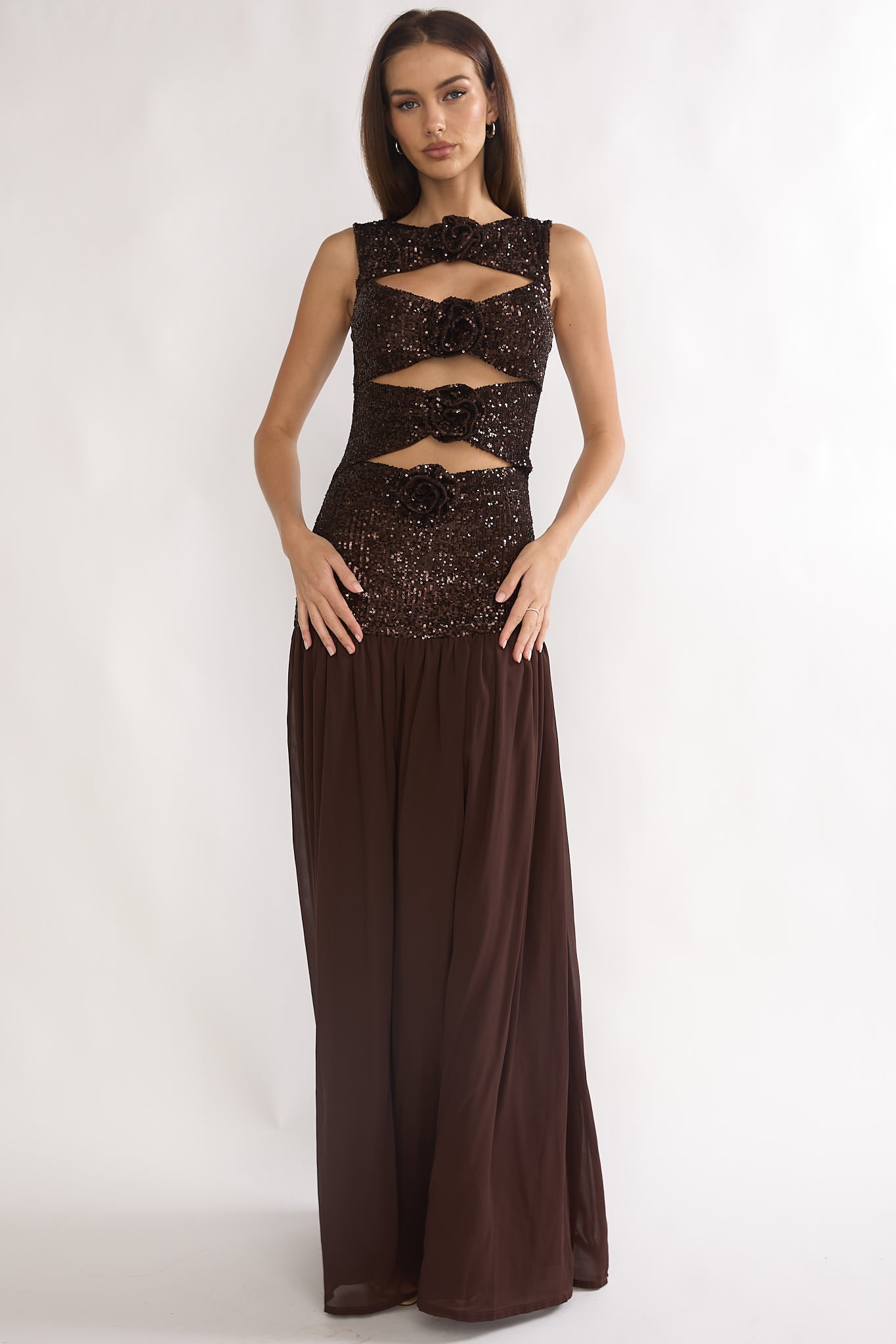 Make them stop and stare in our stunning Dioris maxi dress. It features gorgeous sequins throughout and rosette accents. Wear it to a wedding or special occasion teamed with strappy heels and a clutch for an unforgettable look.