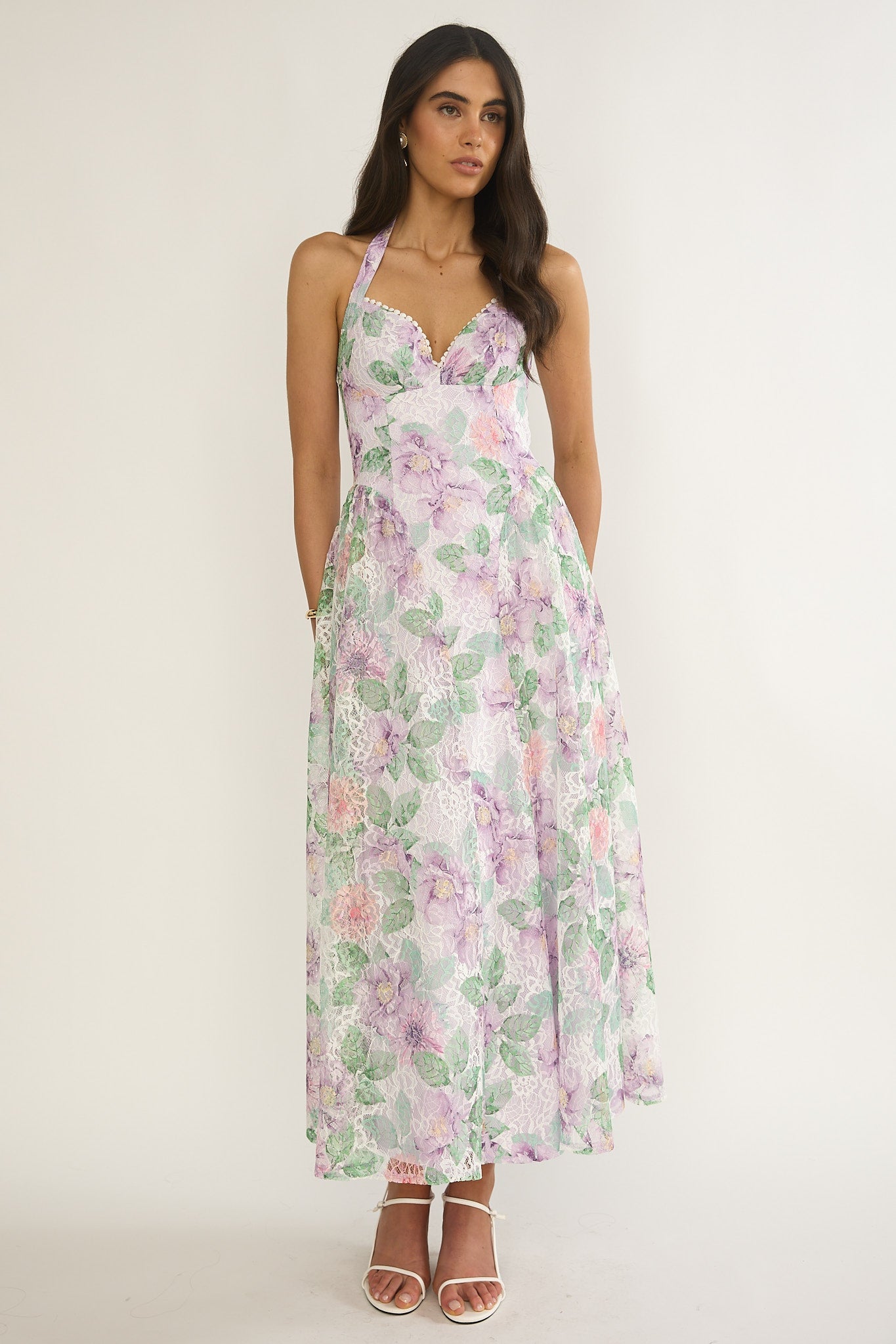 You will feel like a princess in our stunning Florent maxi dress. It features a halter style and gorgeous, printed lace fabric. It's perfect for a birthday celebration or wedding teamed with nude heels and a clutch for a jaw-dropping look.