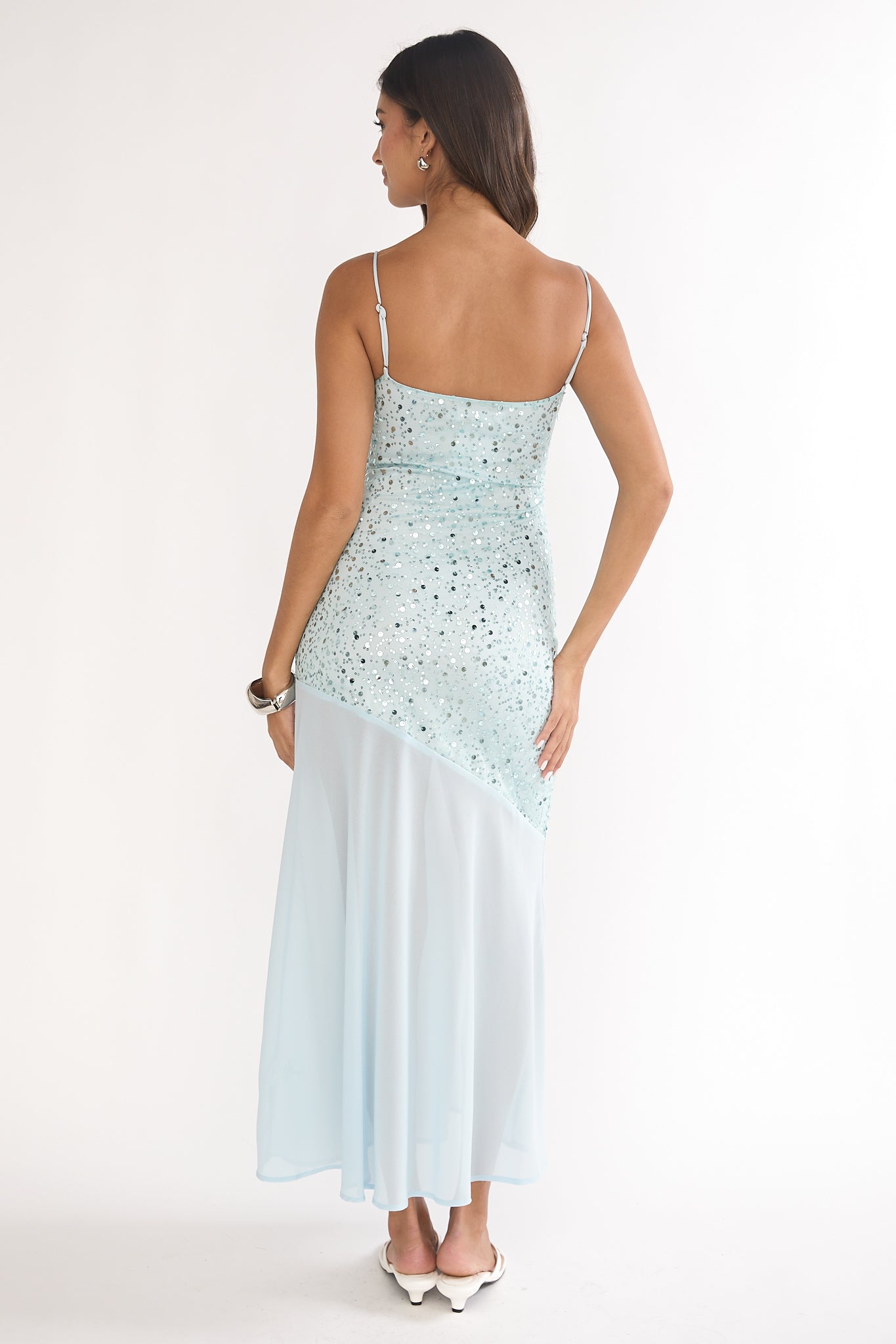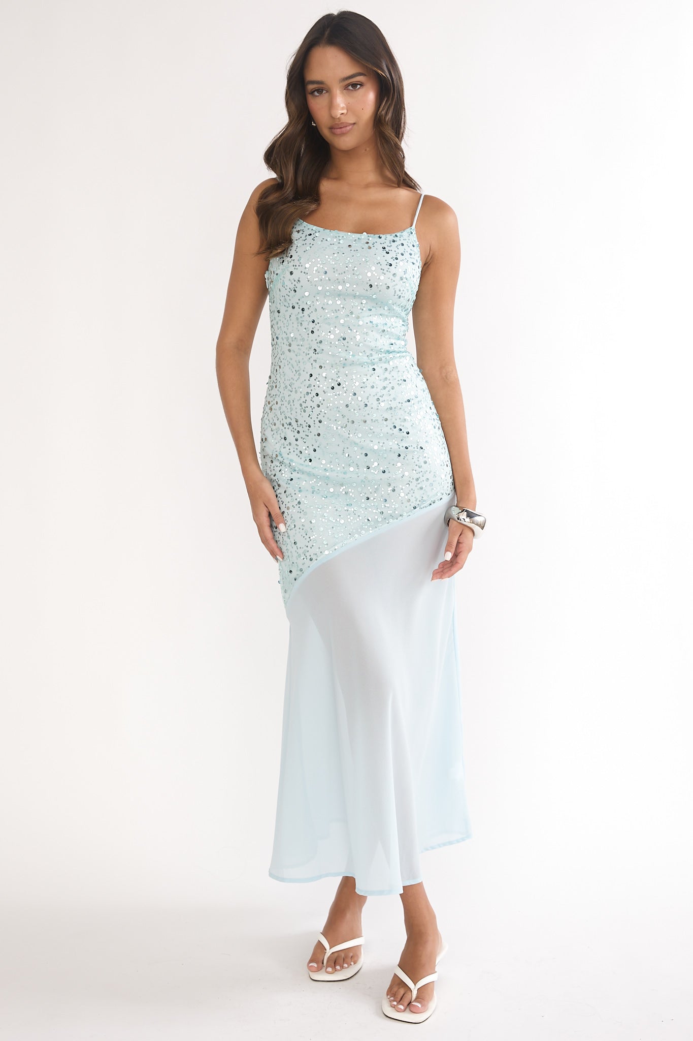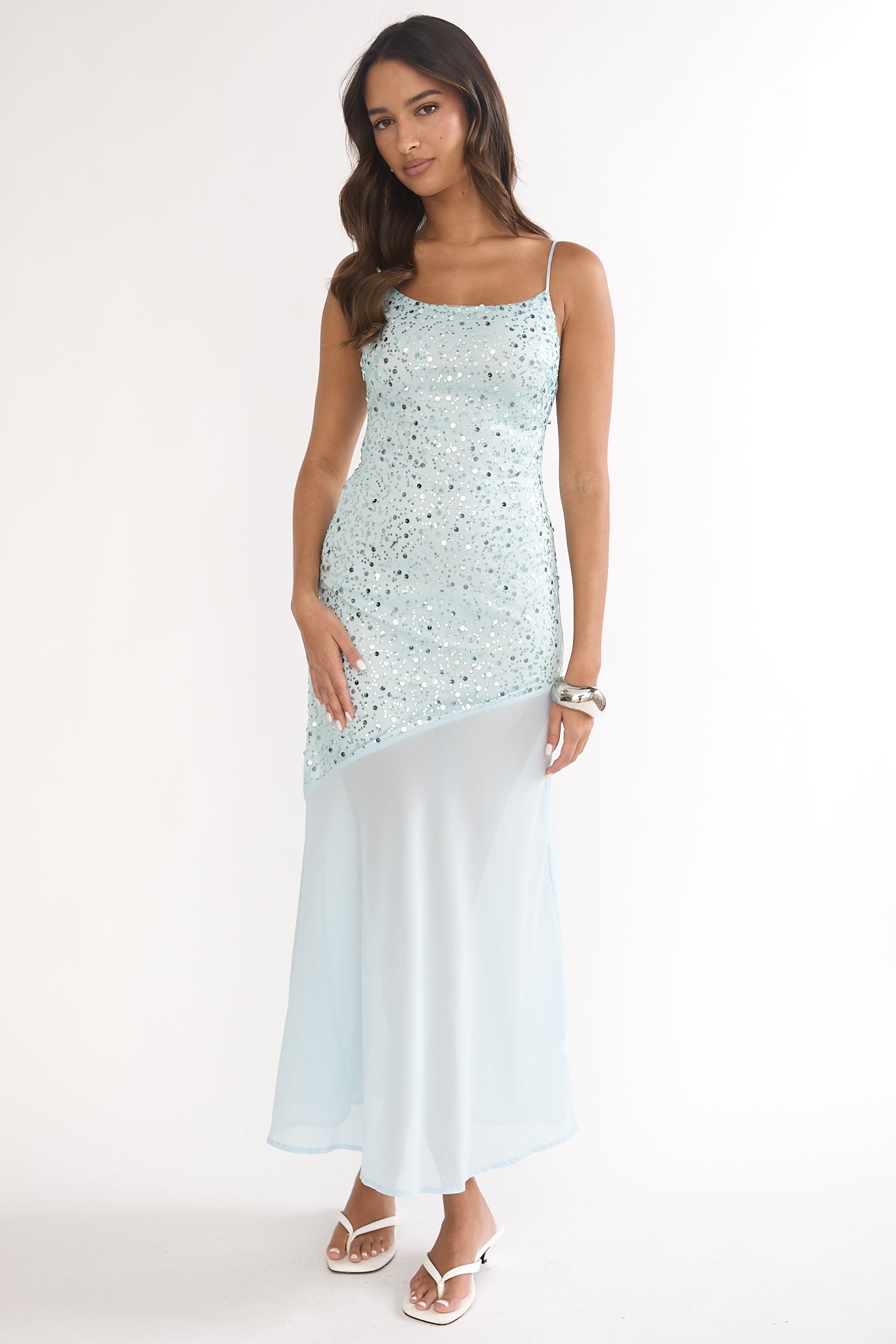 Ooze elegance with our gorgeous Gilded Dream maxi dress! Featuring a contrasting chiffon hem and sequin detail, you will be sure to light up the room when you walk in. Pair it with satin heels and a chic clutch for bridal events or a special celebration.