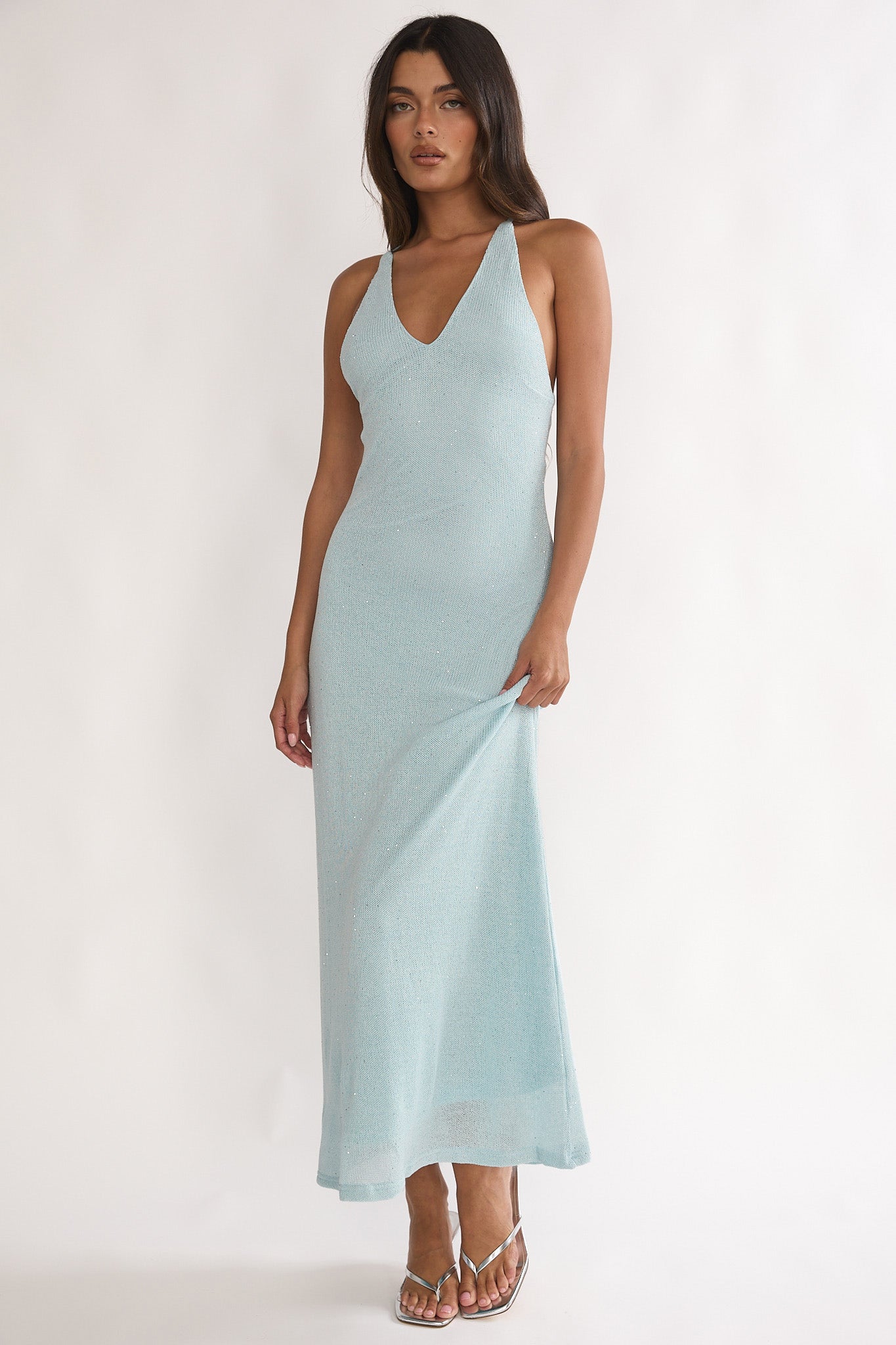 Steal the spotlight in our chic Introductions maxi dress. It features a soft knit fabric with sequins and a criss-cross back. It's perfect for a flirty date night with your lover teamed with nude heels and a purse for an unforgettable look.