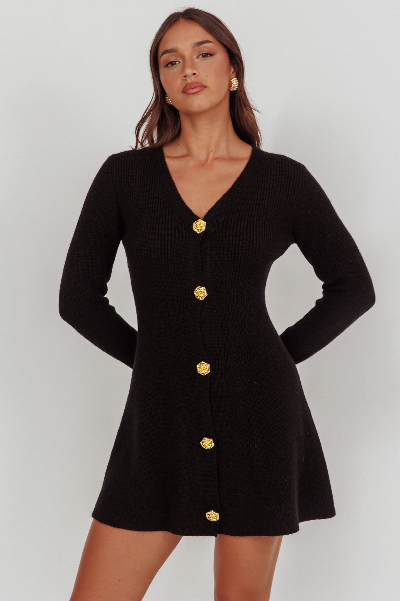 Make an entrance in our super cute Irma mini dress. It features a soft, knit fabric and gorgeous gold rose buttons. Wear it on a flirty first date teamed with boots and a saddle bag for an unforgettable look.