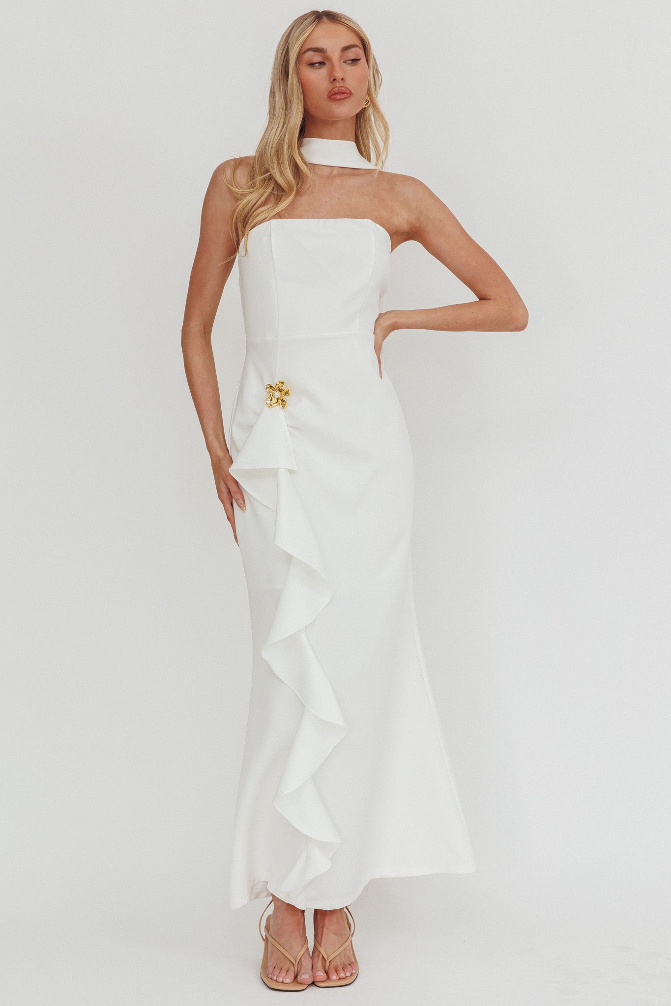 Make an entrance in our stunning Selora maxi dress. We are obsessed with its chic scarf accessory and cascading ruffle detail. It's just what you need for a glam birthday celebration or New Year's Eve, teamed with nude heels and a clutch for a head-turning look.