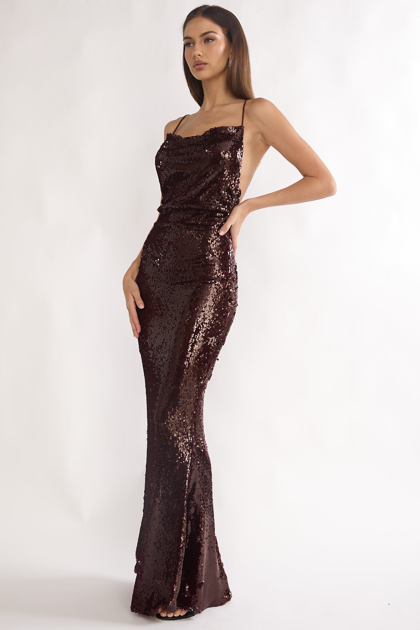 Channel your inner goddess in our dreamy She's The Star maxi dress! It features stunning sequins throughout and an open back with tie closure. Perfect for a cocktail party, or any event where you want a sophisticated yet sexy look. Team it with strappy heels and a purse for a gorgeous look.